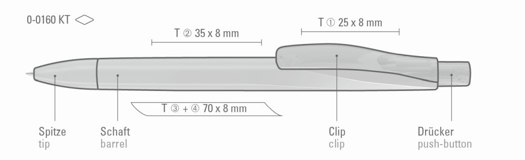 - Werbeanbringung in Clipverlängerung 35mm x 8mm, gegenüber oder seitlich vom Clip 70mm x 8mm Tampondruck